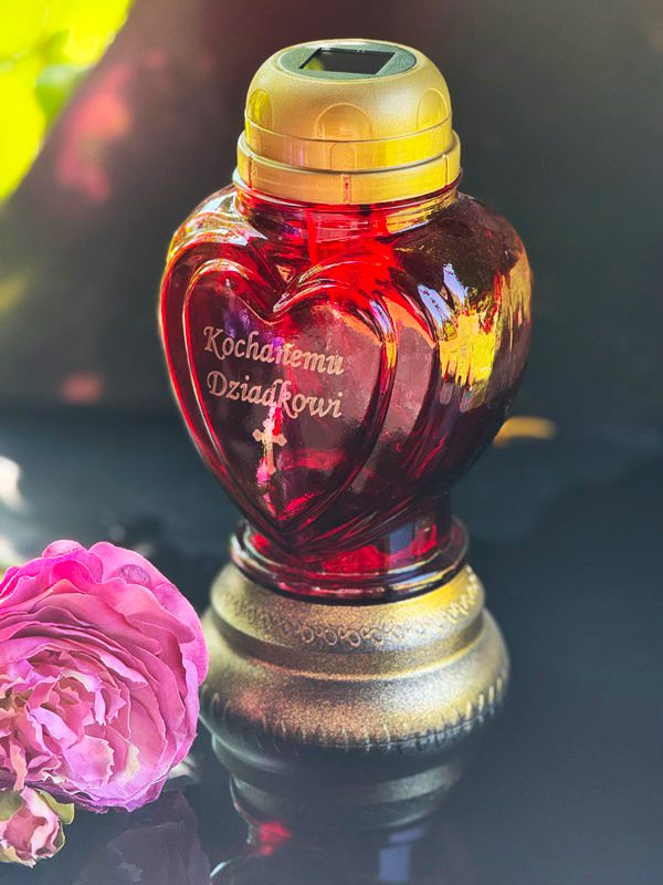 Červená sklenená sviečka v tvare srdca vyjadruje hlboké city a spomienky. Zlatý nápis „Drahému dedkovi“ z nej robí jedinečný symbol lásky a úcty. Zlatá základňa a vrchnák dopĺňajú dizajn a dodávajú mu elegantný a nadčasový vzhľad.
